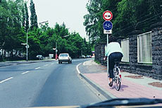 Der Radweg endet hier. Sollte die Radfahrerin ohne auf den Verkehr zu achten auf die Fahrbahn wechseln, haben sie nur eine sehr kurze Reaktions- und Bremszeit um noch rechtzeitig anhalten zu können. Ein Zusammenstoß ist dann kaum mehr zu vermeiden.