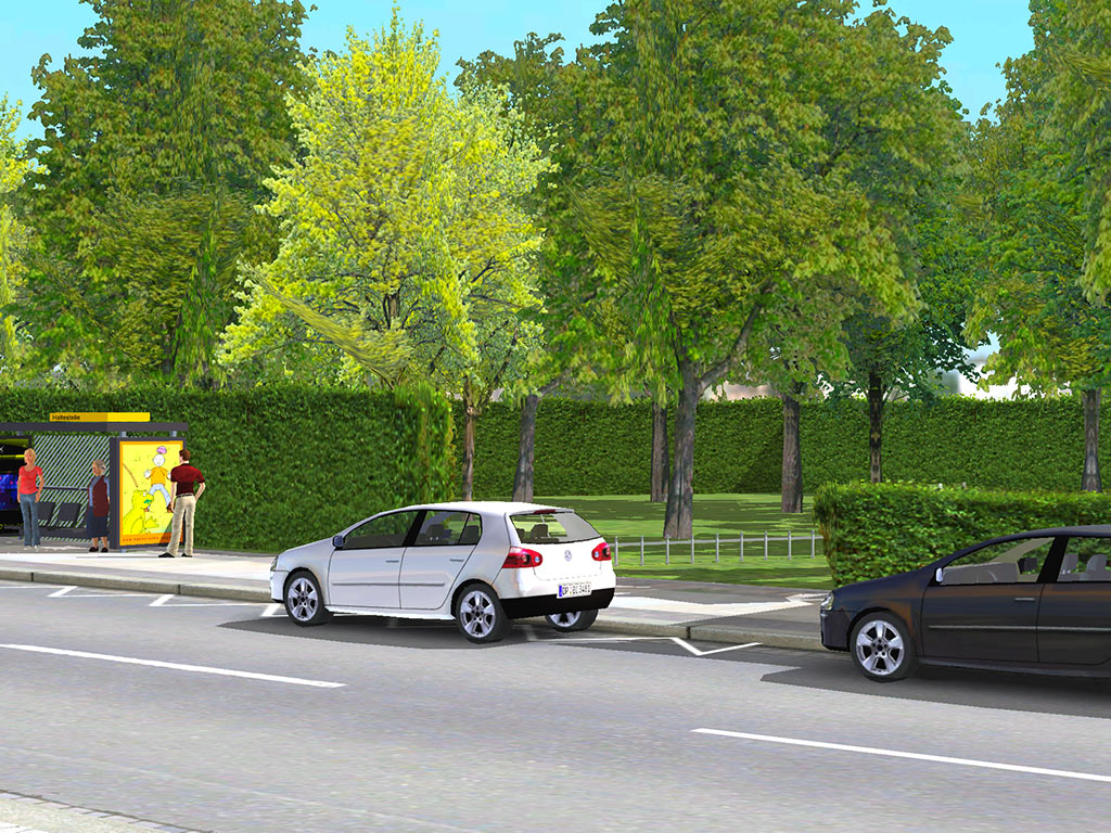 Der abgesenkte Bordstein mag nicht eindeutig sein, die Haltestelle ist aber klar erkennbar und die Zick-zack- Linie ebenfalls. Da der helle Pkw darauf parkt, steht er dort falsch. Deshalb ist Anwort 1 richtig und die Antworten 2 und 3 sind falsch.