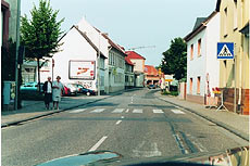 Das Verkehrszeichen am rechten Fahrbahnrand zeigt einen Fußgängerüberweg. Auf der Straße sind dafür spezielle Markierungen angebracht ("Zebrastreifen"). Fußgängerüberwege sollen den Fußgängern das sichere Überqueren der Straße erleichtern.
